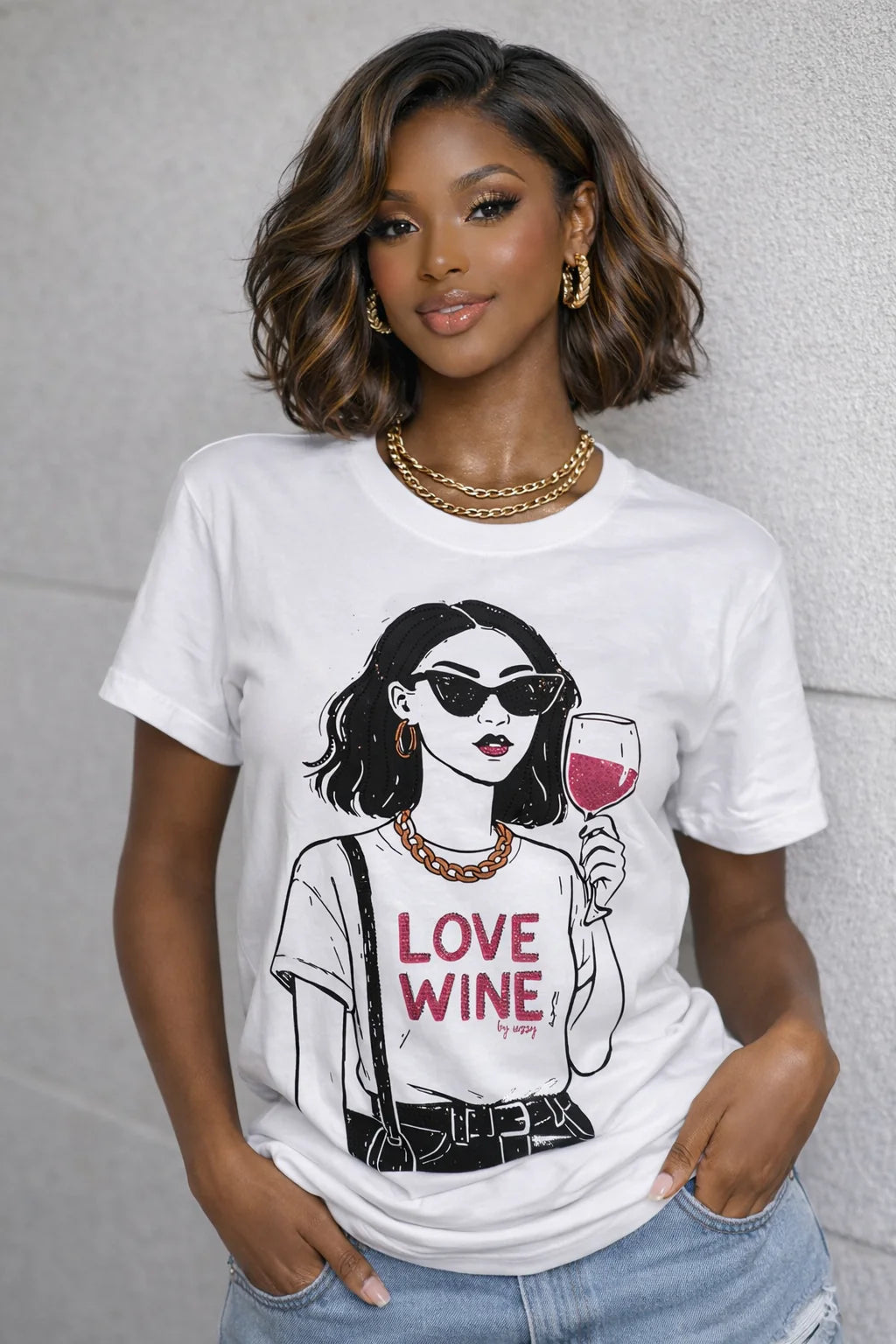 Cheers to cute style! This pink graphic tee features a chic illustrated girl in sunglasses holding a wine glass with "LOVE WINE" lettering. A fun, easy statement top for brunch, girls' night, and weekend plans.